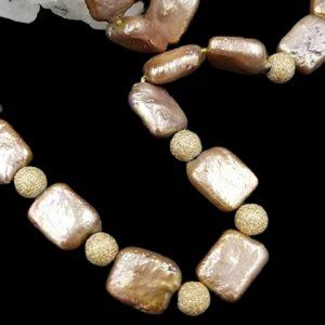 I created this one of a kind necklace from Chinese cultured freshwater pearls. Marvels of modern technology allow for the different shapes and colors. These pearls are rectangular in shape, each pearl approx 3/8" long, and hand knotted on silk. They are a light golden bronze with a hint of pink iridescence. Accenting the pearls are nine 6mm 14k gold beads with a laser finish which gives them plenty of sparkle! The necklace is finished off with a filigree 14k pearl clasp. 20 1/2"