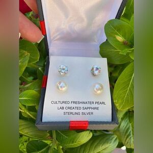 NWT. Cultured Freshwater Pearl and Sapphire Earrings in the Sterling Silver. Newer worn. One clasp is different (see last photo).