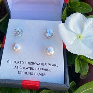 NWT. Cultured Freshwater Pearl and Sapphire Earrings in the Sterling Silver. Newer worn. One clasp is different (see last photo).