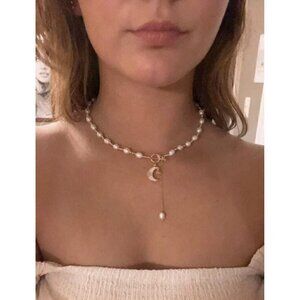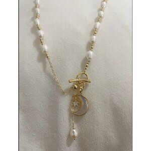 Cultured Pearl Moon Star Charm Necklace OT Buckle White Chain Real Natural