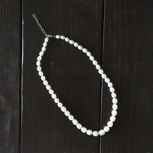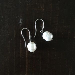 Ringed cultured freshwater pearls grace a graduated sterling silver necklace, three stretch bracelets, and pair of single drop earrings. Pearl measurements are approximate: Necklace 6.0mm to 9.0mm; Earrings 10.0mm; Bracelets 6.0mm, 7.0mm, and 8.0mm. Necklace features a lobster claw clasp. Earrings are shepherd hooks, for pierced ears only. Bracelets have a stretch design for easy on/off wearability. Worn once as a bridesmaid.