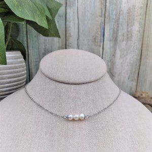 Cultured pearl silver tone chain necklace. Measures 16 inches. Silver tone lobster clasp closure and extender chain. Pearls measures about 7mm. Handmade in the USA. New with tags.