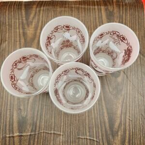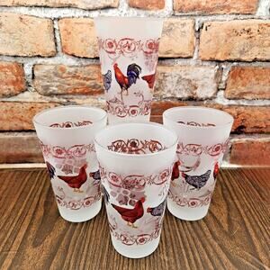 Set of 4 frosted pint glasses by Culver, featuring red floral designs and colorful chickens and roosters. Brand new in box with original packaging. Each glass holds 16 oz. Perfect for farmhouse kitchen decor or gifting!