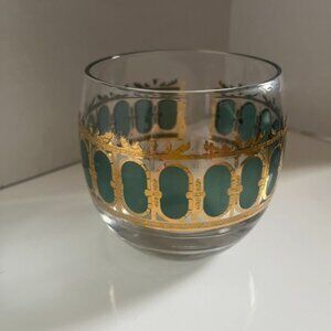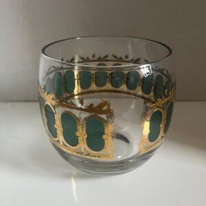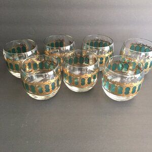 This Culver Mid-Century Modern Roly Poly Lowball Glasses set exudes elegance with its intricate gold detailing and rich emerald hue. Ideal for collectors or enthusiasts of vintage glassware, these glasses offer a luxurious touch to any gathering, showcasing timeless design and craftsmanship from the 1960s.