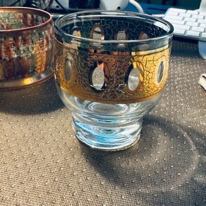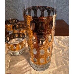 The Culver Pisa Gold Cocktail Pitcher 8pc Set is a vintage barware set that exudes Mid-Century Modernism style. Made of glass, this set features a sleek and elegant design that adds a touch of sophistication to any home bar or kitchen collection. With the brand's reputation for quality craftsmanship, this set is sure to make a stylish addition to any cocktail enthusiast's collection.