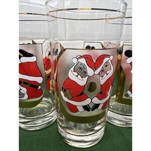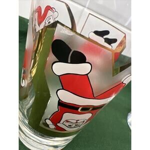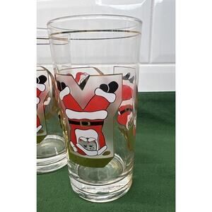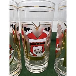 In excellent condition. Four Culver signed highball glasses featuring acrobatic Santa’s spelling out JOY outlined in gold.