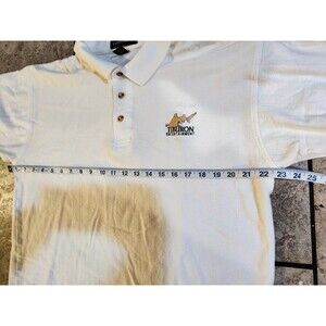 The cream-colored polo has an embroidered striped pattern and is a size L. It is perfect for travel, activewear, casual, workwear, and business occasions. This shirt is not only stylish but also comfortable to wear, making it a great addition to your wardrobe.