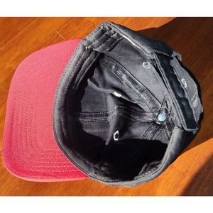 QE2 Voyage of the Seven Wonders World Cruise 2006 hat baseball cap. The hat is black. The QE2 logo is an embroidered patch. The top of the bill is black ribbed with black thread. The bottom of the bill is red and ribbed with red thread. It has a strap for adjustability.