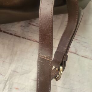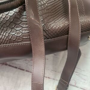 CUORE & PELLE "Musette" Carryall Leather Satchel Bag in Dark Brown. Top zip closure, Gold tone hardware, Studs on the bottom, Fully lined interior, Interior has two slide in and one zip pockets. ***Refer to the last 2 photos for damage to the crossbody strap. Double handles with 7" drop Adjustable and removable long strap with 20"+ drop Approx measurement top 17.5" bottom 14.5"W x 11"H x 4.5"D Measurements are taken lying flat and are approximate. *Free from rips and stains *Comes from a smoke free home *Fast shipping *No trades, No holds, No modeling Thanks for looking!