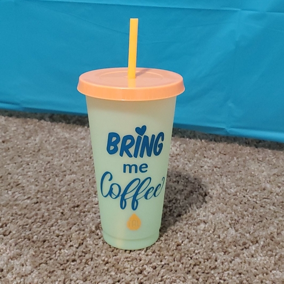 Color changing to different shade,bring me coffee,permanent vinyl,plastic,24oz,Tumbler,straw,lid,new never used,no tag.