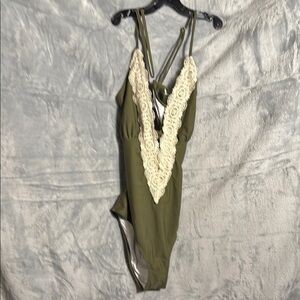 Stylish olive green swimsuit with elegant cream lace trim. Perfect for a chic beach look. This swimsuit is in great preowned condition no underwire boho pretty lace details tiny spot on lace in picture