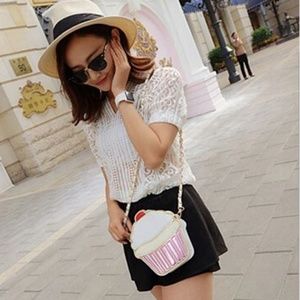 Cute little cupcake bag with cherry on top. Gold chain over white vegan leather strap.