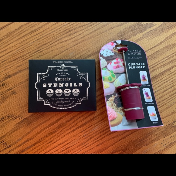 Set of Williams Sonoma Halloween Cupcake Stencils and a Chicago Metallic Cupcake Plunger (cuts a hole in the middle of the cupcake to allow for a filling to be added.)