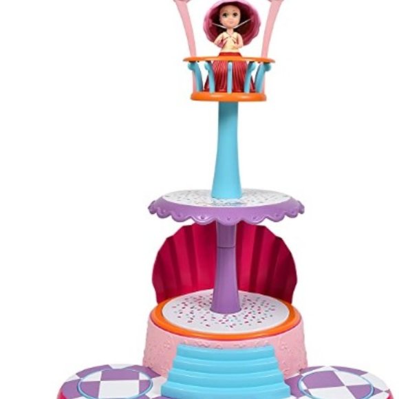 Cupcake Surprise grand cupcake ball play set. Turn manually orange button to make the lower dance floor spin, play music and lights up needs 3 AA batteries not included. (Tested and it works has on/off button if you want to use with out the music). First photo stock. Pre-owned used once for ice cream party then stored for a couple of years. Used platform to house ice cream sundae toppings. See last photo, took off removable tower and replace with birthday sign. Includes the dance floor tower, one cupcake doll, paper cupcake cutout, and two paper cutout dolls.