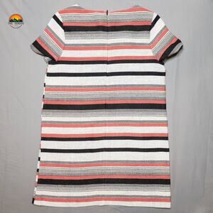 Add a playful touch to your wardrobe with this Cupcakes and Cashmere 'Olvera' mini dress. Featuring a vibrant multicolor striped pattern in shades of white, black, and coral, this woven dress offers a chic and casual style. The short sleeves and shift silhouette create a comfortable fit, while the front patch pockets add a touch of functionality. Perfect for warm weather and everyday wear. It is in excellent pre-owned condition.