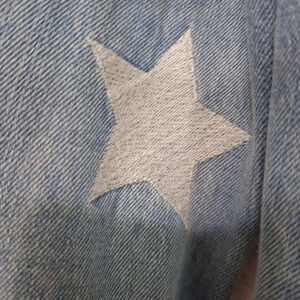 Features: Embroidered Stars, Pockets, Frayed, Rounded Hem