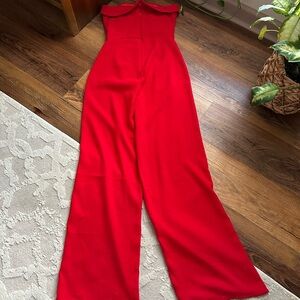 Stand out in this vibrant red strapless jumpsuit. Sleek and stylish for any event.