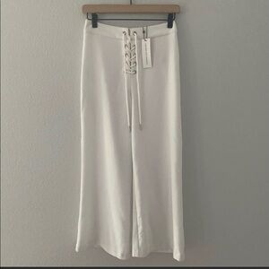 The esperanza is a chic lace-up cropped culotte pant in a soft suiting material with a wide leg cut and a hidden back zipper for easy pull on. New with tag attached.
