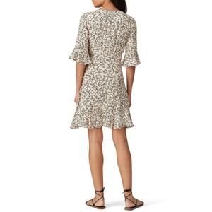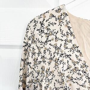 Button corset bodice detail. Floral printed crepe. Short sleeves. Ruffled details at the sleeves and skirt. V-neckline. Hidden back zipper closure. Partially lined.