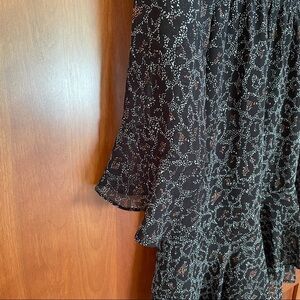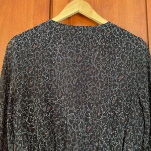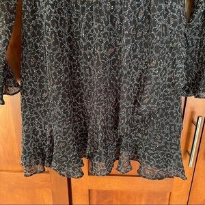 Black leopard print dress from Cupcakes and Cashmere. Front ruffle detail, elastic waist. Sleeves are sheer.
