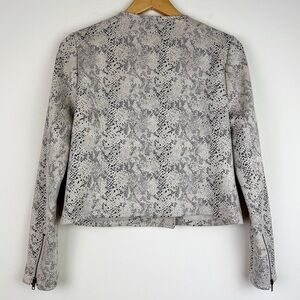 Mix up your moto style in this fresh take on the classic biker jacket done in faux suede patterned in a tantalizing snake print.