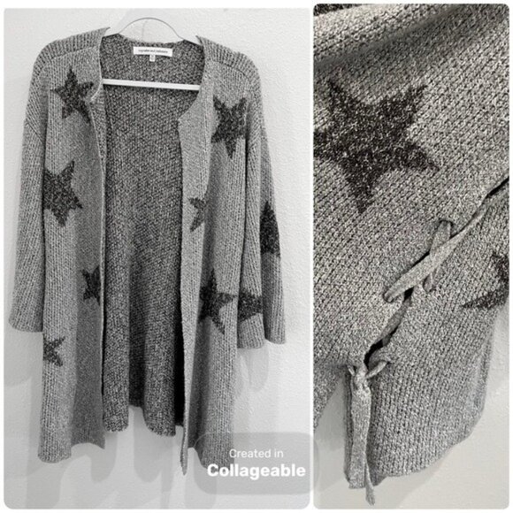 Fun gray cardigan with star accents and braided sides. Open front design flare sleeve.Perfect for layering.