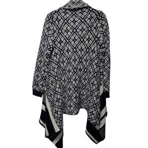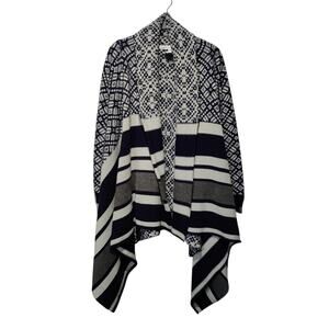 Cupcakes and Cashmere women's thick cozy sweater in wool blend. Open drapey waterfall cardigan. Navy blue and grey with nordic style print on top and stripes on bottom.