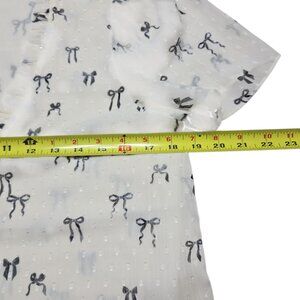 Color/Pattern: Ivory/cream base with black/gray bow print and subtle metallic accents; textured Swiss-dot/clip-dot finish
