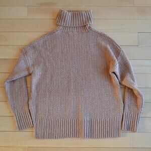 Elevate your wardrobe with this cozy and chic Cupcakes and Cashmere turtleneck sweater. In a beautiful brown hue, this size medium sweater is perfect for cooler weather. Its soft knit material ensures warmth and comfort, making it a staple piece for any fashion-forward individual. Features a chunky, oversized, fit.