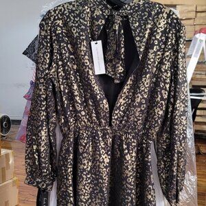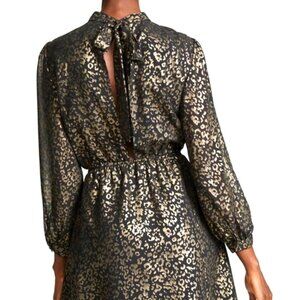 Fabric: Chiffon Metallic threading Leopard pattern - Mini dress cut - Mock neck - Long sleeves - Tie keyhole at back - Covered elastic at waistLinedShell: 100% polyester - Lining: 100% polyester - Hand wash - Imported, China Measurements Measurements from size S Length: 34.75in / 88cm, from shoulder
