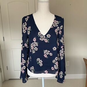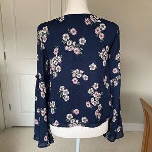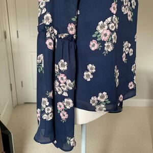 Anthropologie Cupcakes and Cashmere v neck blouse. Beautiful navy with a floral print. Semi sheer and fully lined. Pretty tie detail on a fluttery sleeve. Excellent condition with no flaws.