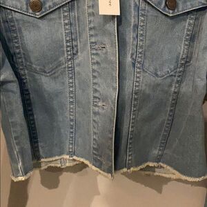 Fringed hem lends a distressed aesthetic to this denim jacket.