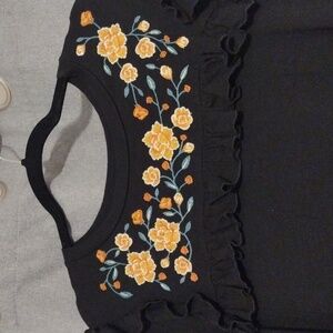 Chic black dress with vibrant floral embroidery. Perfect for any occasion. Ruffles around the flowers and top of shoulders.