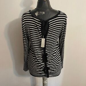 Cupio Black White Stripe V-Neck Bowtie Back sweater, size L (97% Viscose, 3% Spandex)