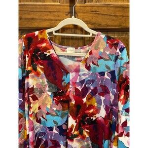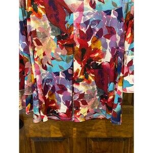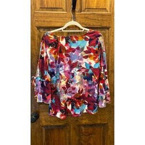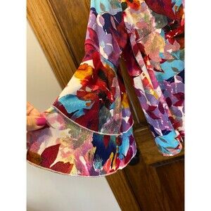 Cupio Blouse Size Large Colorful Bright Pink Purple +Stretch V Neck Bell Sleeves