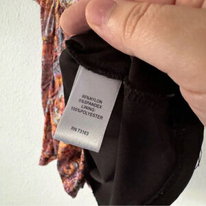 • features peek a boo short sleeve, cold shoulder, cold shoulder, multicolor mirror image paisley floral patterned. Blouse top is lined. Top has stretch in addition to approx measurement by est 1-2in