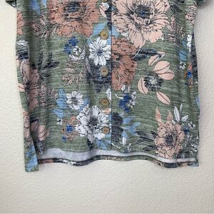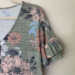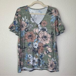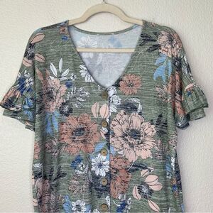 Cupio Button Down Floral V-neck Short Ruffle Sleeves Top