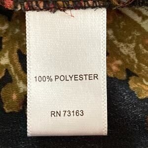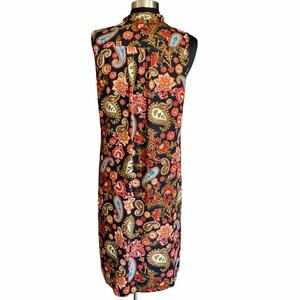 Cupio Dark Floral Paisley Print Sleeveless Long Line Top Button Up Size Large. This piece has a dark background with brown, orange, pink, and blue hues of paisley and floral designs. At first glance, this looks like a shirt dress. It has a long 17" slit at the sides which makes it more appropriate to wear with leggings or pants. In excellent preowned condition.