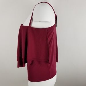 A new stretchy maroon draped ruffle top No rips or stains Armpit to armpit: 20" Length: 21" AA9