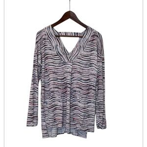 Like New without tags, excellent pre owned condition. Long Sleeved V front and back with small triangle opening from the back. Soft viscose and spandex blend, very flattering and easy to wear and layer most seasons. Multi colors Pink Purple white in wave pattern.