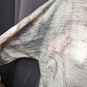 This top is in gently used condition. It is a textured distressed knit material. It has a floral print design. The cuffs are fitted. The body is loose and over sized. Please see photos for details.