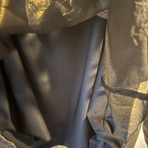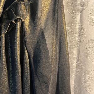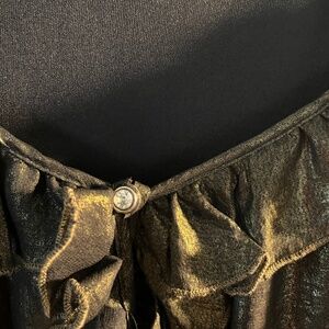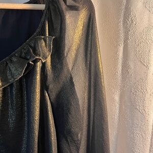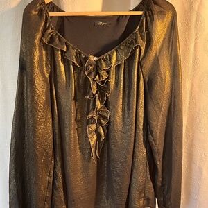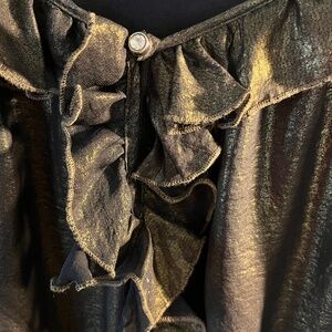 Make a statement this Holiday season with this gorgeous semi sheer metallic bronze blouse. It has a nice wide neckline for a little extra, along with the ruffled collar and a sparkly center accent. Flowing and comfortable, left to hang freely or a semi tuck.