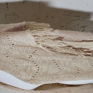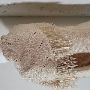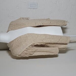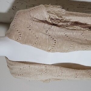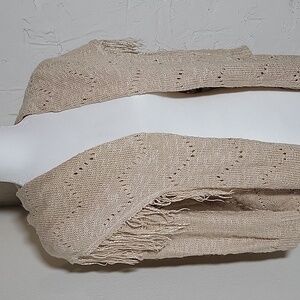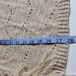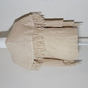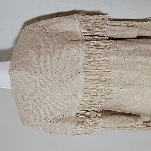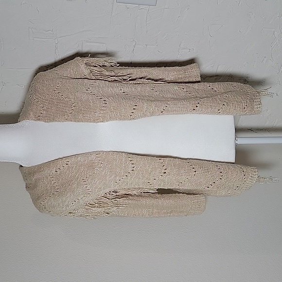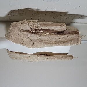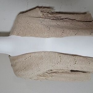 Wrap yourself in cozy, carefree style with this gently used women's Cupio Open Front Cardigan Sweater size medium. This piece features a lovely oatmeal/tan open-knit construction, making it lightweight and breathable for layering year-round. The chic fringe/tassel trim along the sleeves and bottom hem adds a distinct Bohemian or Western flair. Designed with a relaxed fit, long sleeves, and an open lapel collar, it's the perfect versatile piece to throw over a tank or tee for a casual yet fashionable look.