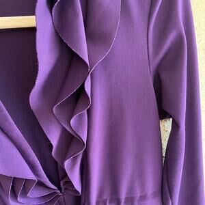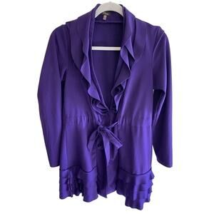 Excellent pre-owned condition. Purple long sleeve open blouse with tie at waist. Layered ruffle detail around neck & down open front & around bottom. Has stretch. Rayon/polyester/spandex material. Approx. measurements: Shoulder to hem 32”, pit to pit 20”, sleeve length from neck to sleeve hem 28”. Size M.