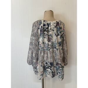 Cupio Top Womens Medium Blue Floral Boho Sheer Peasant Blouse Lightweight Tunic