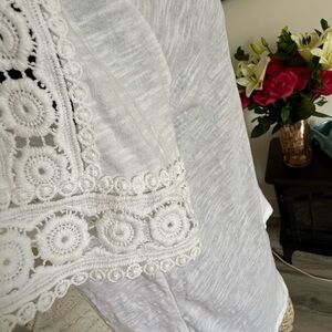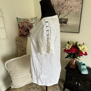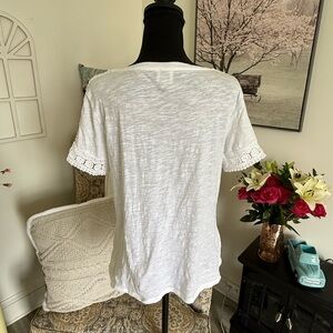 This Cupio top is a relaxed white t-shirt featuring short sleeves with delicate lace detailing, offering a stylish twist to a classic silhouette. The soft fabric and scoop neckline ensure comfort and elegance, making it a versatile addition to any wardrobe.