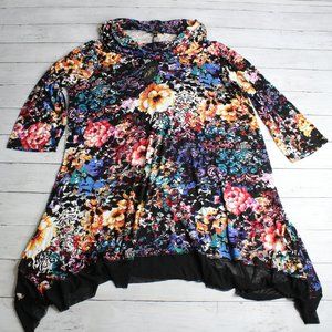 Cupio Women's Tunic Top Plus Size 2X Black Floral Cowl Neck 3/4 Sleeves
