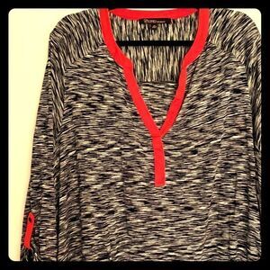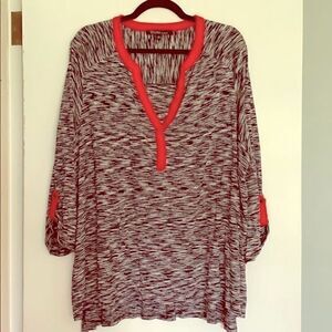 Cupio 3X soft tunic with contrast trim on notch collar and tab sleeves. Extra soft tunic drapes beautifully. Nice yoke detail in back. Orange red trim at neckline and button sleeve tabs punch this up. Excellent WFH wear or leisure wear. Pull it on and look put together right away.