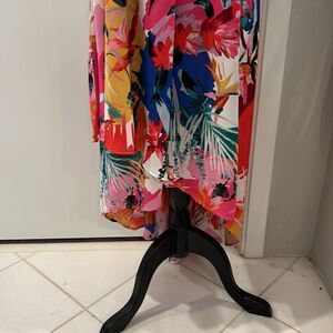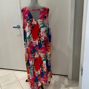 Pretty Cupio curvy dress is floral with bright colors. Front tie with tassel ends. V-neck. Strap across back shoulder. Flowing design. High front, low back. Underarm flat across is 26”. Front length is 37”. Back length is 52”. New without tags.
