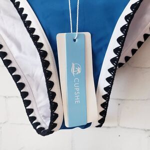 Cupshe Bikini Bottom Size L Blue White Black Trim Cheeky NEW. Brand new with tags.